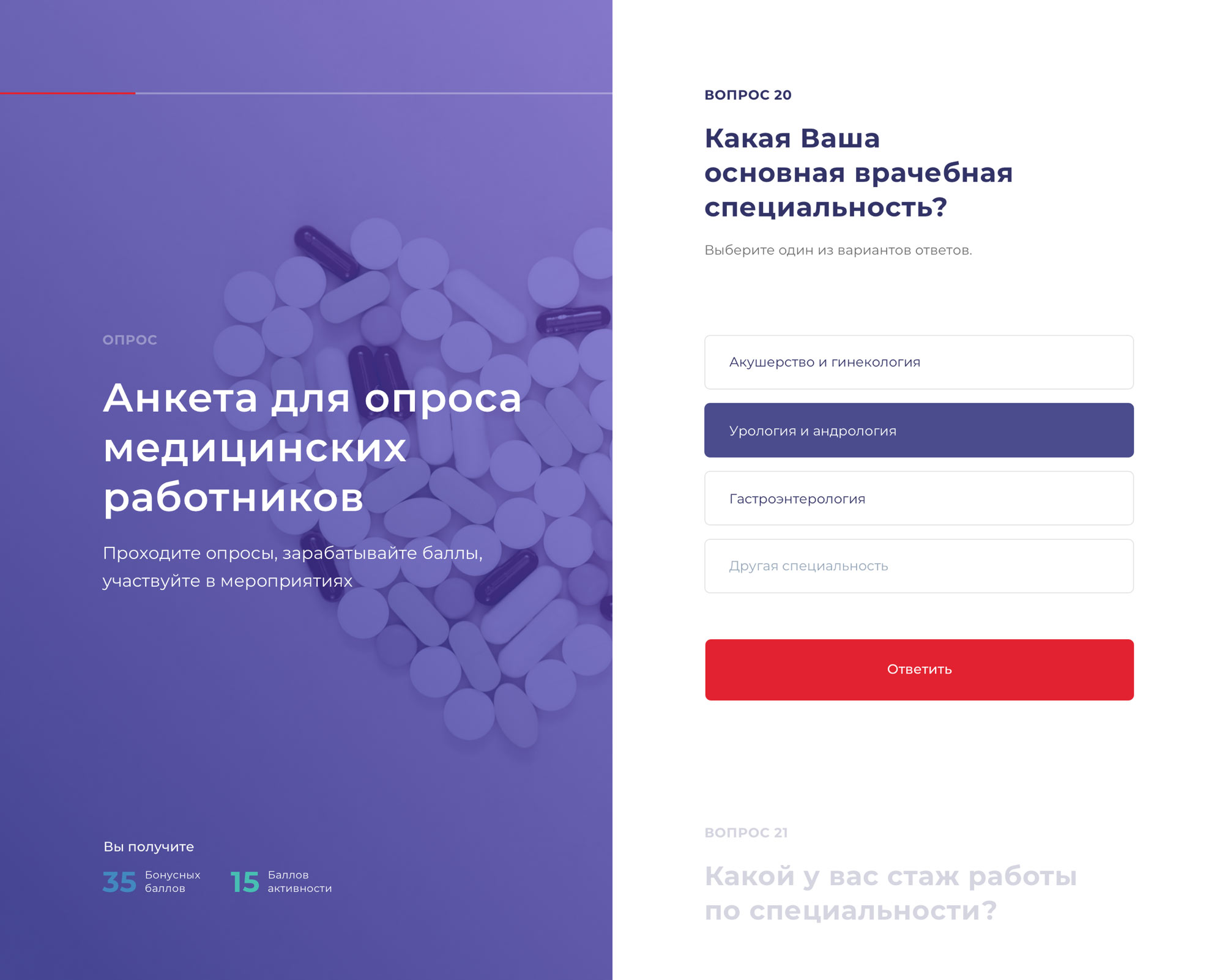 Опросы – один из важных разделов портала. Мы придумали новую механику: после того, как пользователь ответил на вопрос, система автоматически открывает следующий. Переходы между вопросами быстрые и плавные. Опрос сразу загружается целиком со всеми возможными сценариями. После этого время на обновление информации уже не требуется.