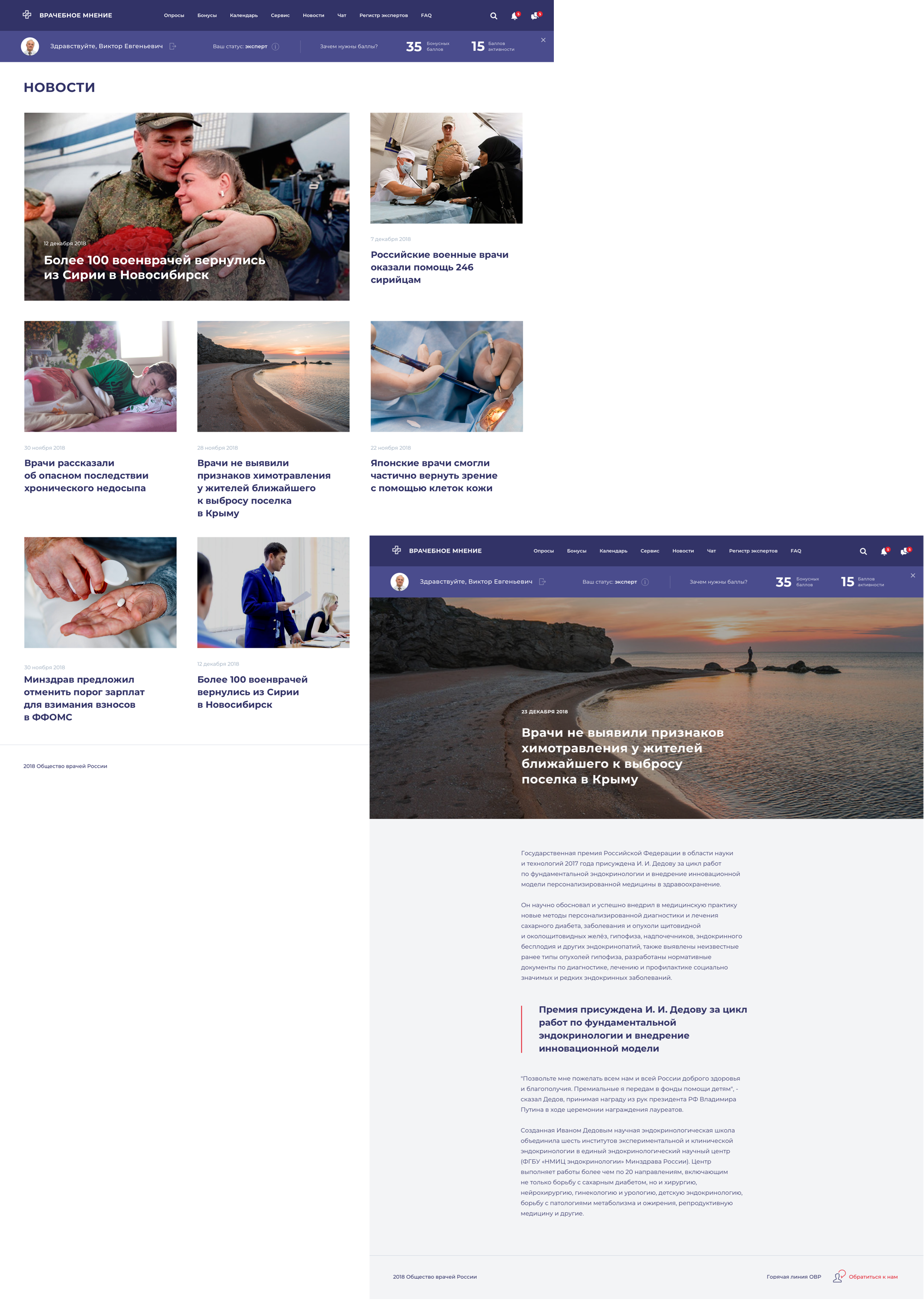 Портал служит источником информации для практикующих врачей. Мы взяли за основу контрастную сетку, чтобы выделить главное. В разделе главная новость всегда расположена в большом блоке сверху. После клика на новость текстовый блок разворачивается без перезагрузки.