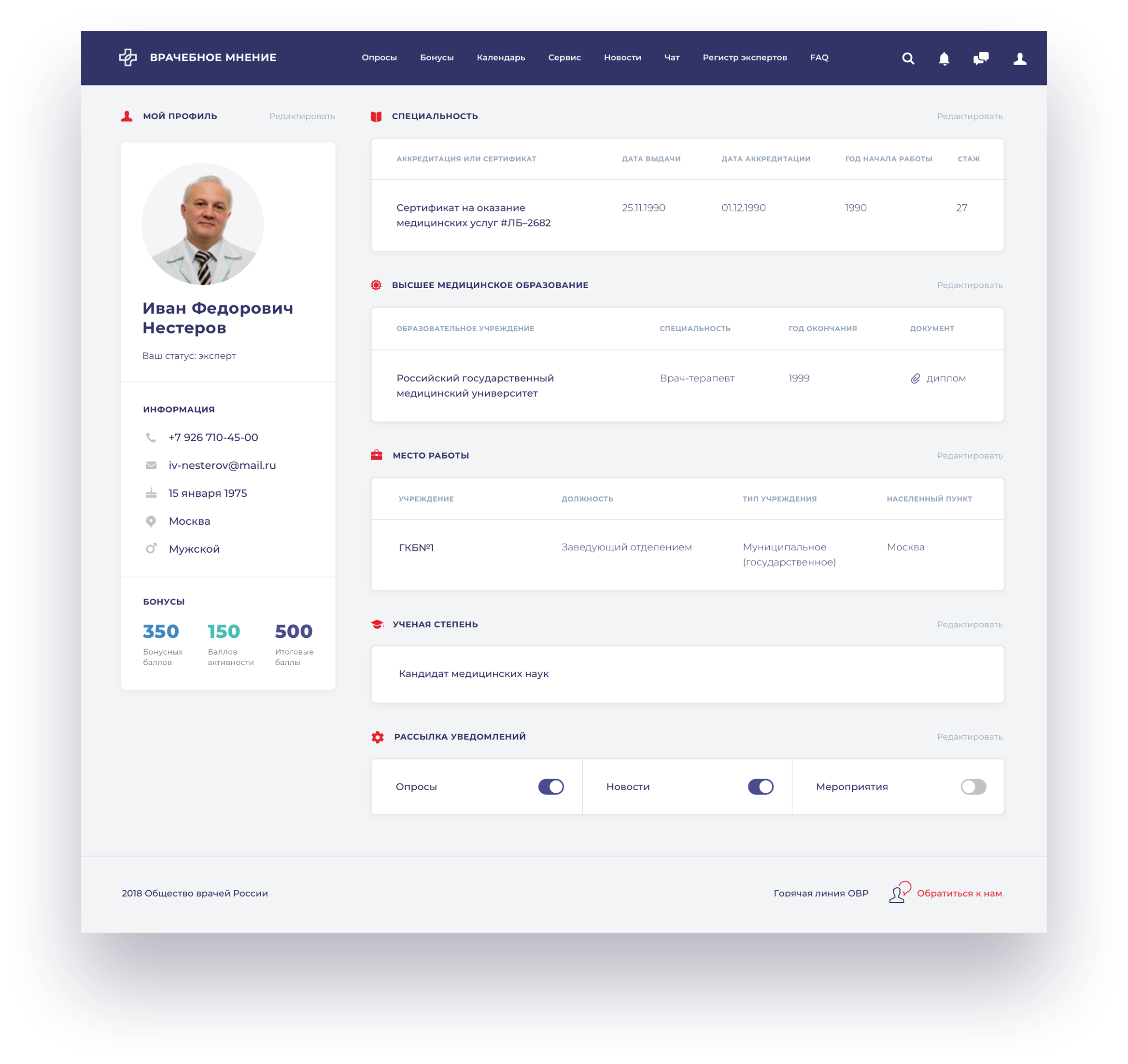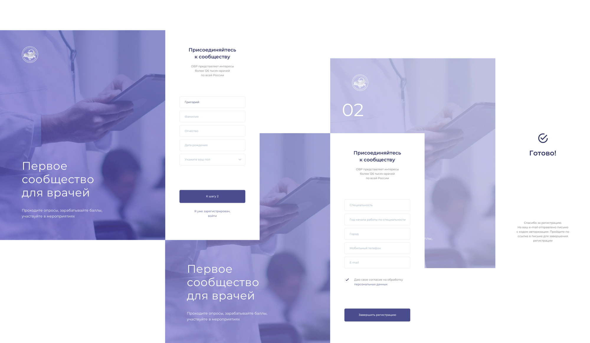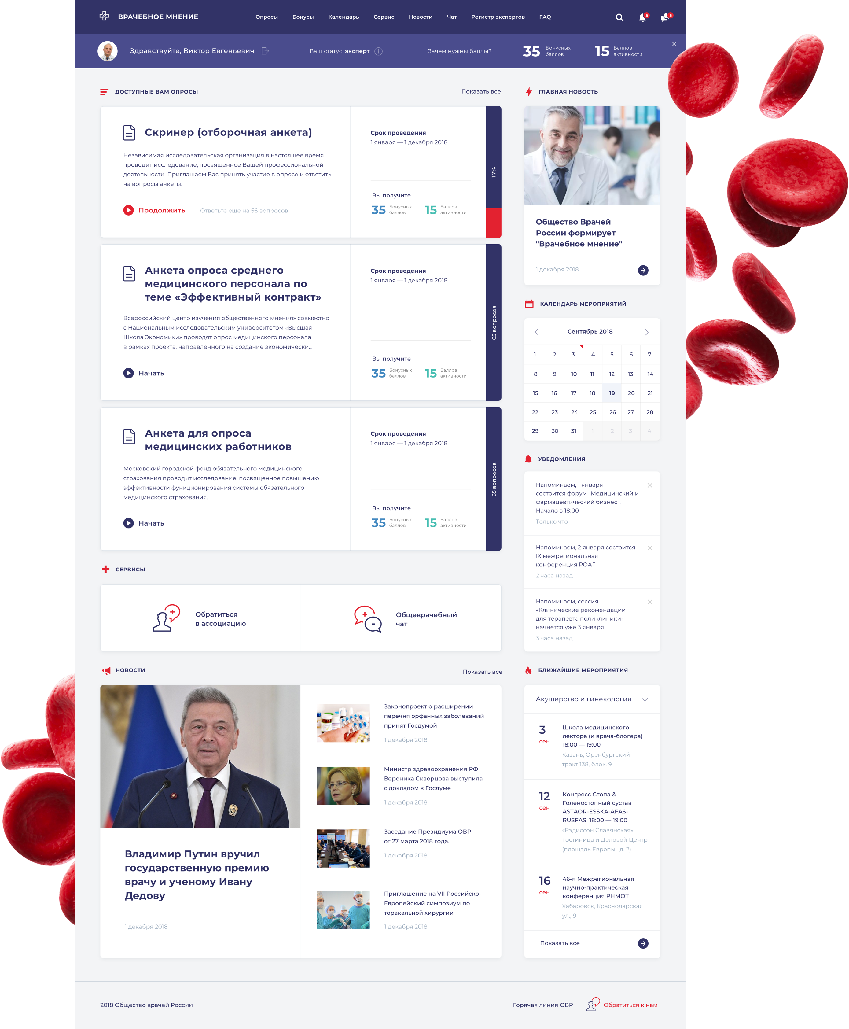 Портал «Общество врачей России» — единая платформа для врачей России. Проект создан для врачей-экспертов, где они могут делиться своим мнением, проходя опросы, обсуждать свой опыт с коллегами, участвовать в мероприятиях и получать приятные бонусы. Мы разработали минималистичный, функциональный дизайн: порталом удобно пользоваться и ничего не отвлекает от сути.