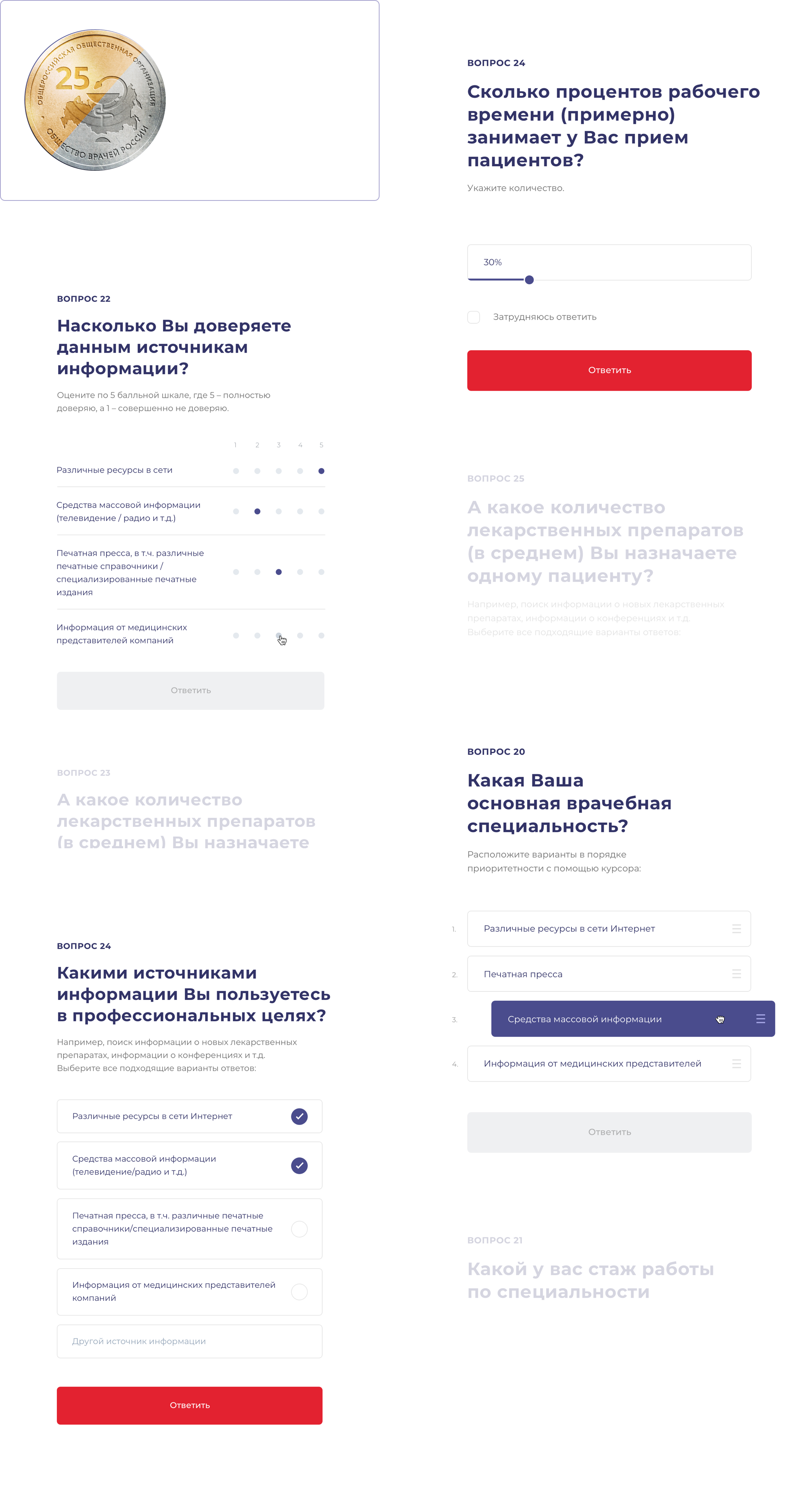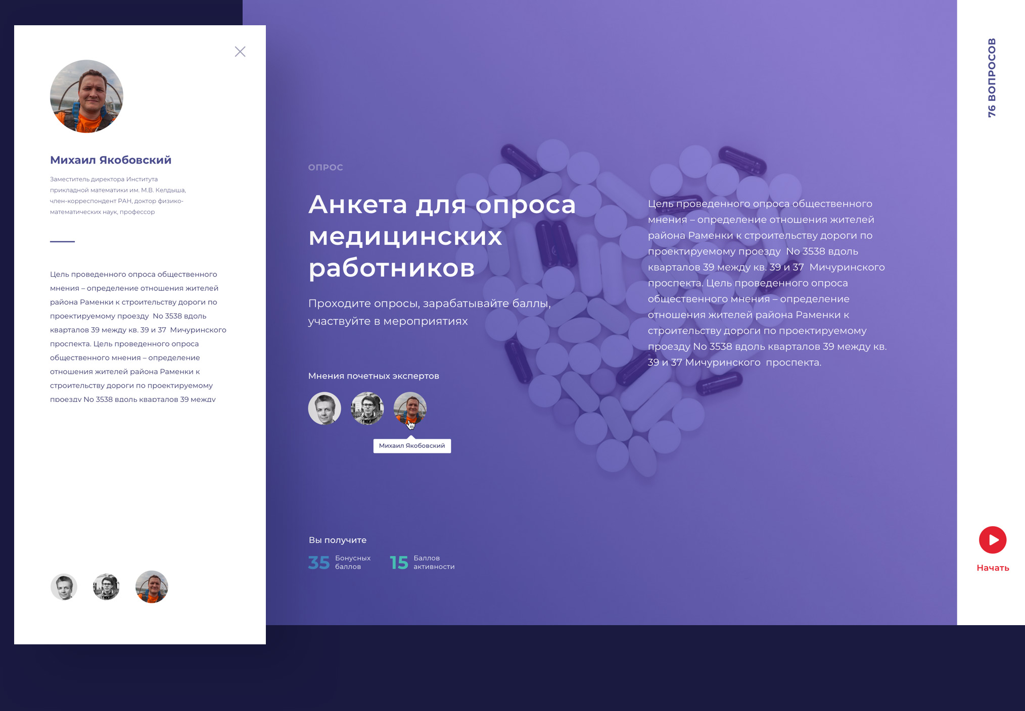 Опросы – один из важных разделов портала. Мы придумали новую механику: после того, как пользователь ответил на вопрос, система автоматически открывает следующий. Переходы между вопросами быстрые и плавные. Опрос сразу загружается целиком со всеми возможными сценариями. После этого время на обновление информации уже не требуется.